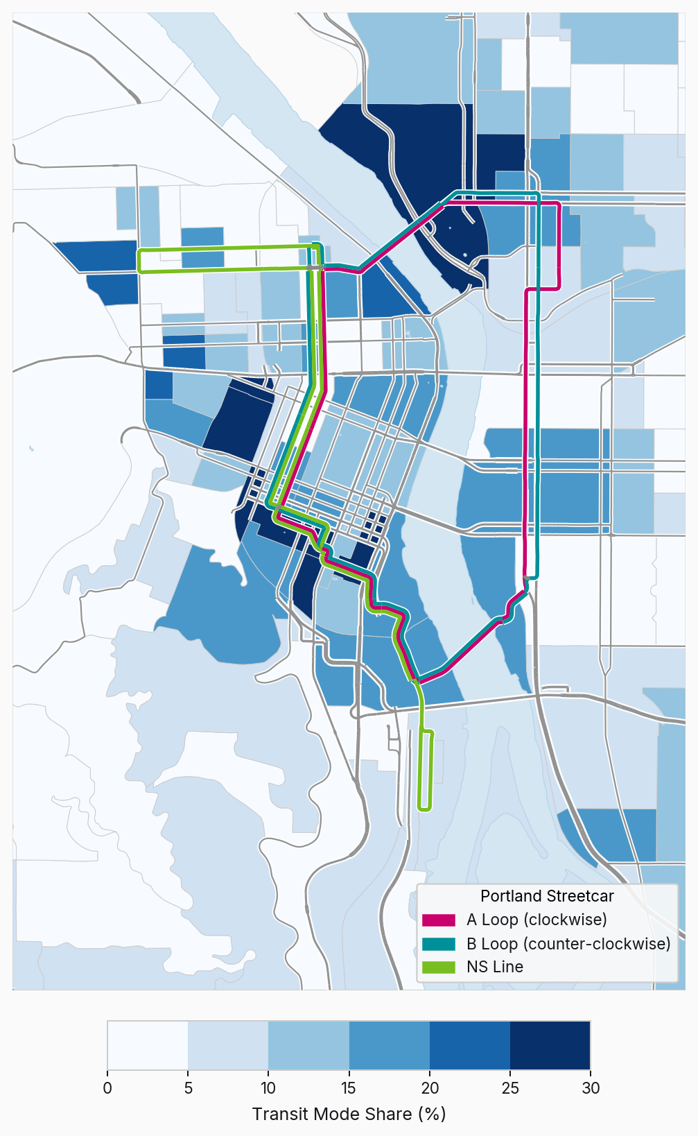 Portland eastside streetcar loop, today generally called the "A and B loop", consists of 5.3km of track, built for $150 million in 2007. At 2,600 average weekday riders, it significantly underperforms the NS line streetcar and nearly every frequent service Trimet bus line. These ridership numbers are largely a result of lackluster service: trains on the loop run every 30 minutes in each direction, creating long waits for trains and making transfers to the streetcar difficult.